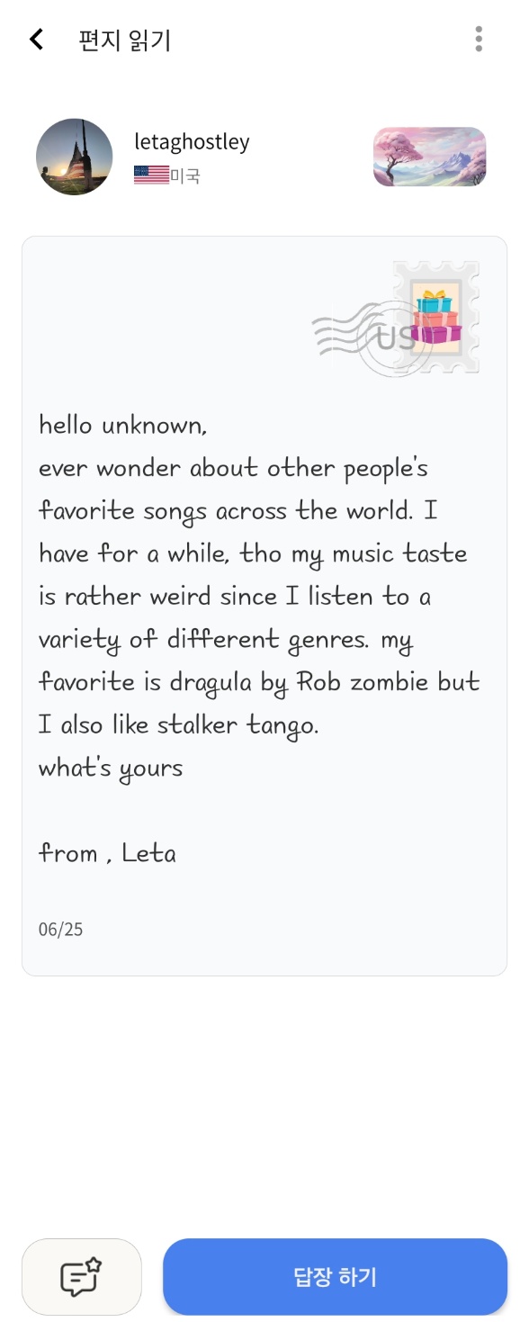 한국, 일본, 미국 등 전 세계 사람들과 편지를 주고받는 국제 교류 앱이에요. 단순한 소셜 네트워크 대체가 아니라, 더 깊이 있는 관계를 만들어가는 플랫폼이죠! 🌏